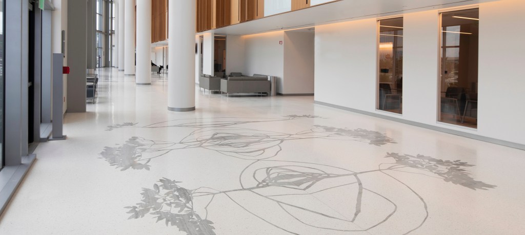 Materials: Various colored marble water jet cut laid into a terrazzo floor