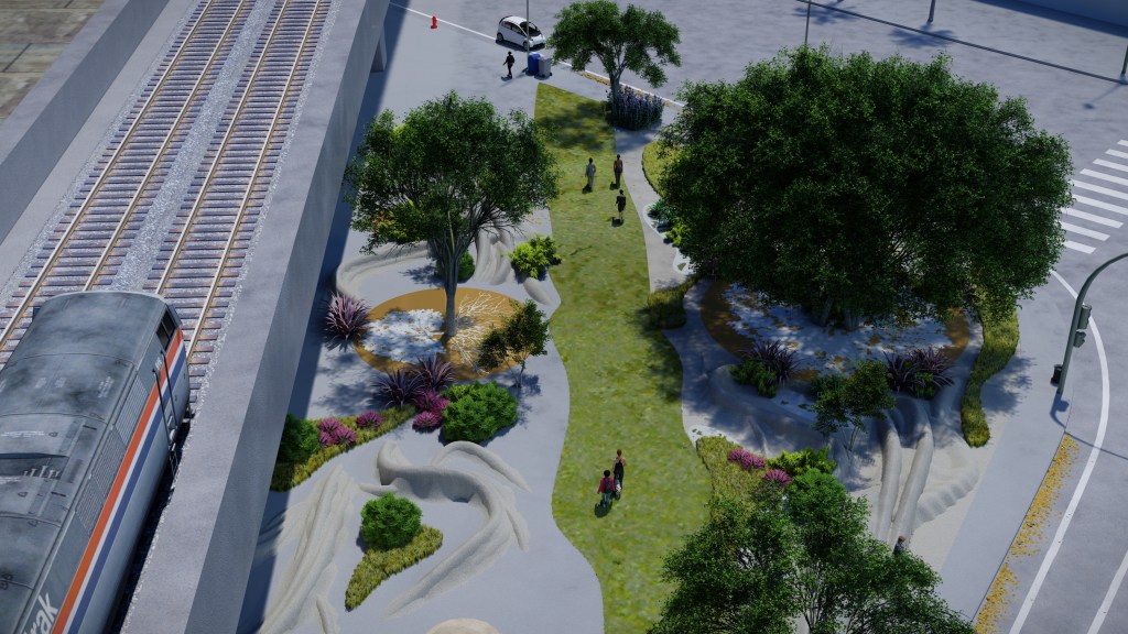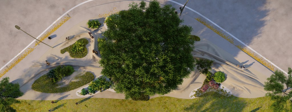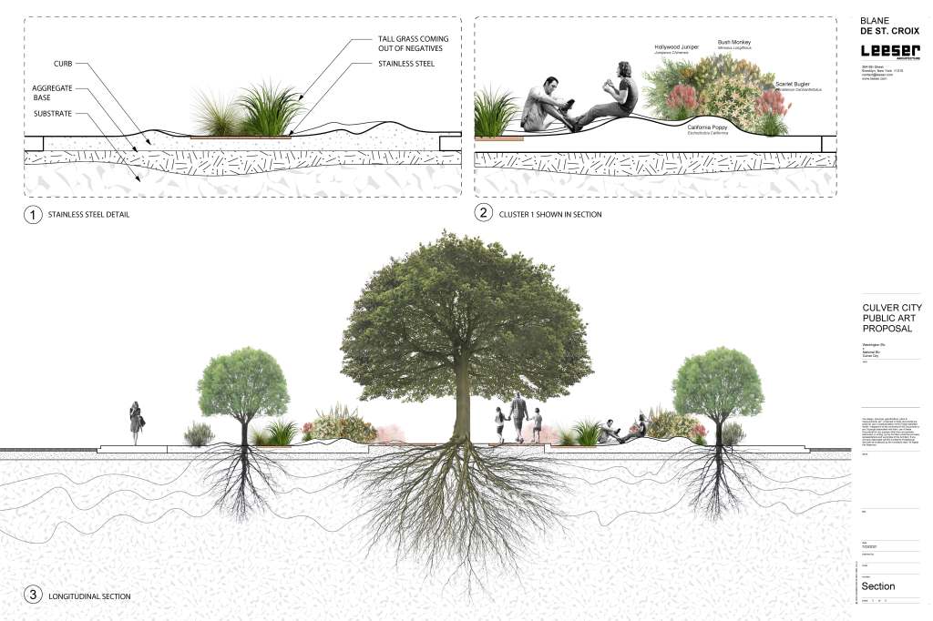 This is a day and night artwork. In the evening the public is enriched by the the splendor of technicolor glowing from the central tree and reflecting color across the plaza throughout the landscape. They can also hear the songs of nocturnal birds in the distance. Even the metro riders will be able to view technicolor radiating across and into the train.